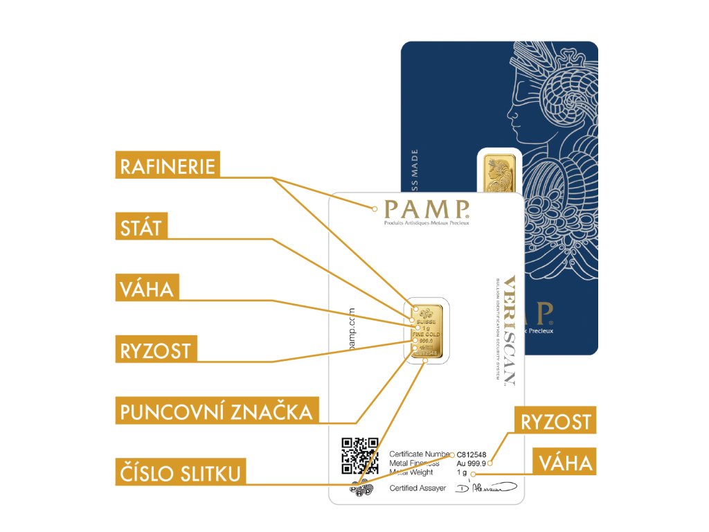 - Slitky jsou zalisovány v ochranném plastovém obalu (blistru), který zároveň slouží jako certifikát. Blistr obsahuje unikátní sériové číslo.